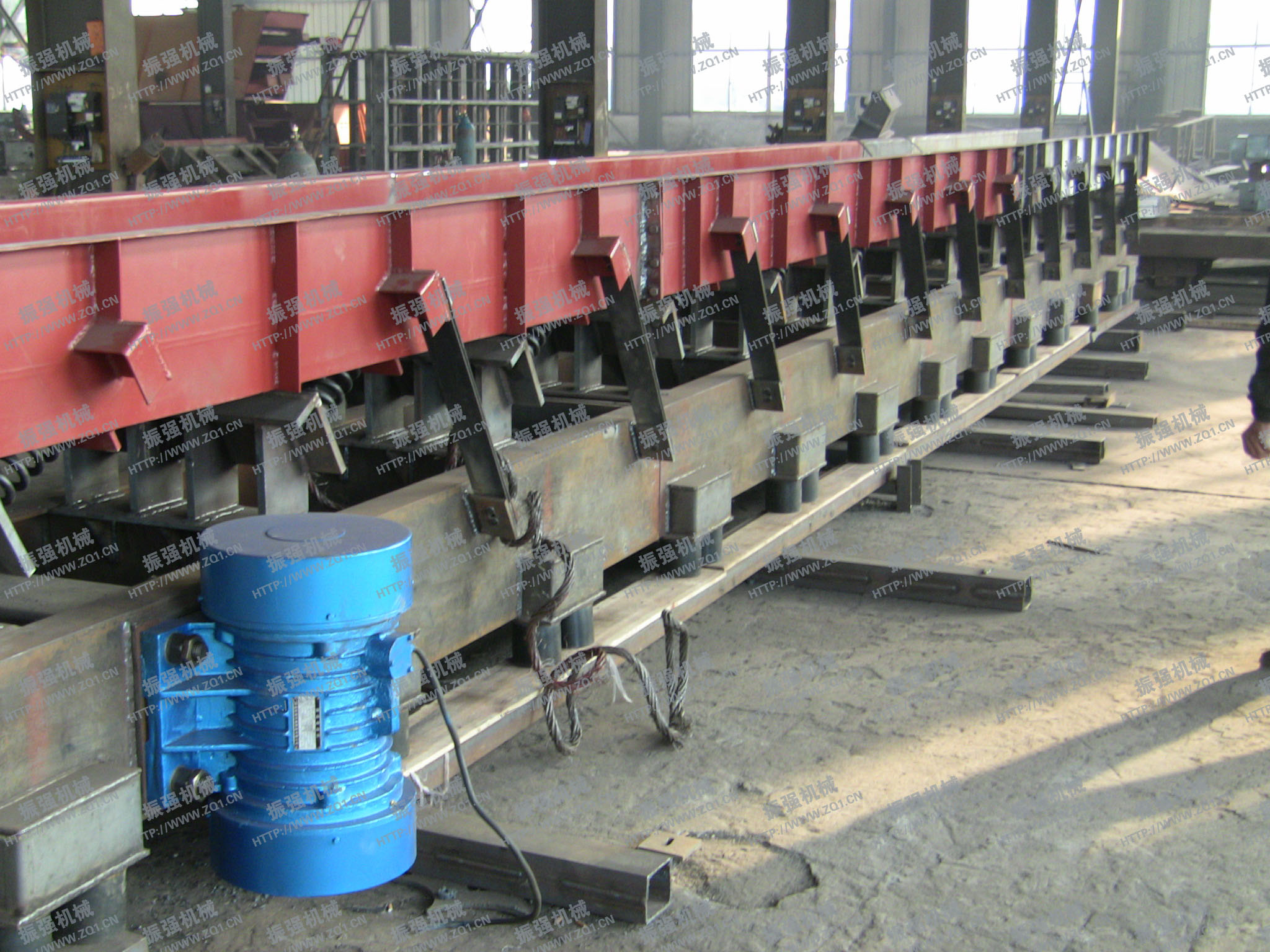 - SZF型慣性振動輸送機采用兩臺振動電機作為激振動源,運用自同步原理,兩臺振動電機反向轉動,使輸送機底部平衡架產生往復振動,經過主振簧與導向板簧的作用,帶動上部輸送槽振動,從而達到輸送物料的目的。該機是一種通用輸送機械,除用于水泥行業外,還可用于冶金、礦山、化工、電力等行業,是一種理想的新型輸送設備。